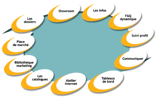 showroom Lieu de présentation des nouveaux produits (fiches techniques, tableaux de bord, agendas des événements, exportations de documents ou de matériaux de communication, mini-sites événementiels, Espace Relation Presse, etc.) |